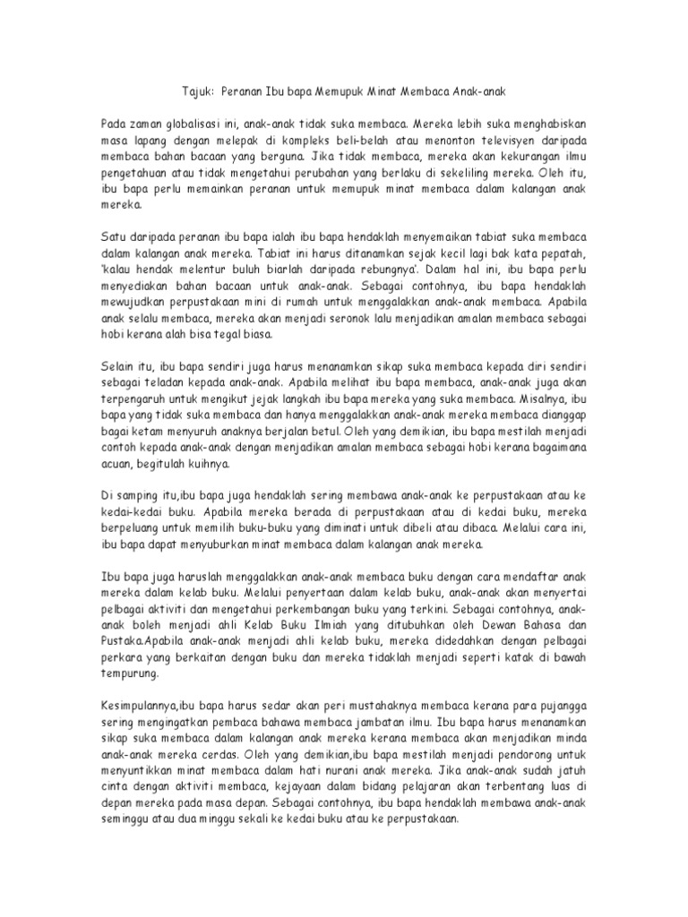 Peranan Ibu Bapa Dalam Memupuk Minat Membaca Dalam Kalangan Anak. Akhirulkalam semua pihak haruslah berganding bahu untuk memupuk minat membaca dalam diri masyarakat dan tidak melepaskan tanggungjawab itu kepada pihak kerajaan semata-mata. Karangan Ramalan Bahasa Melayu SPM 2018.